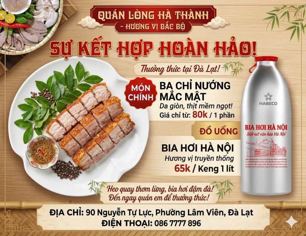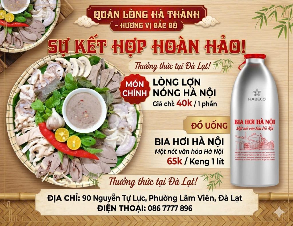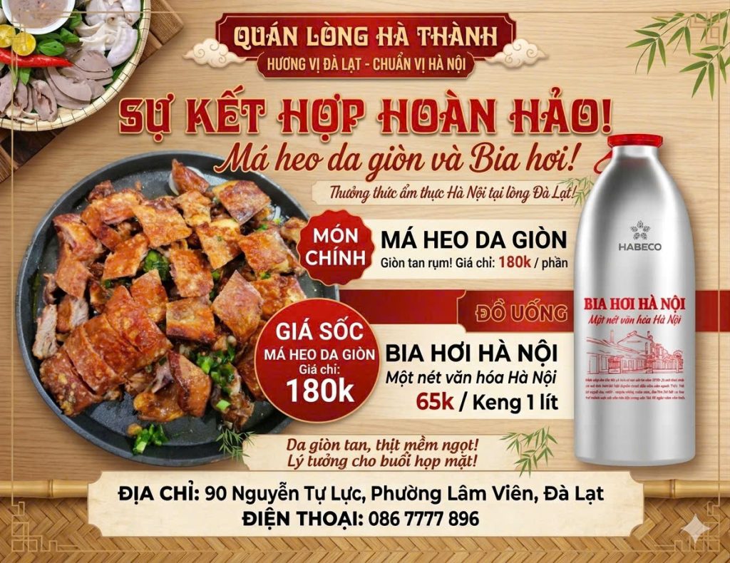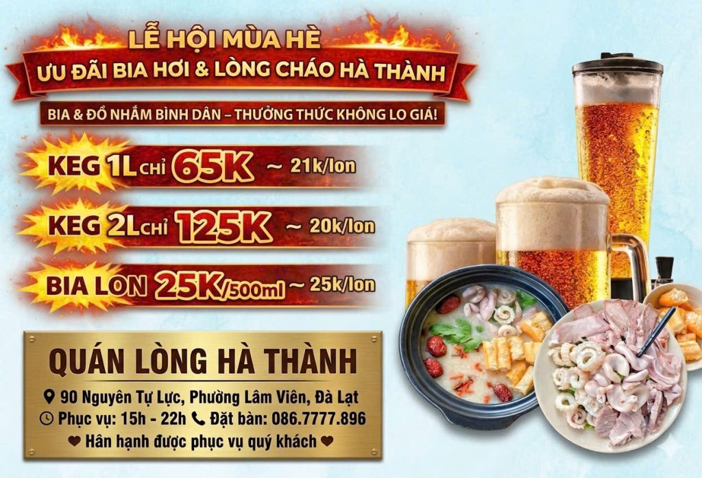 Đây không chỉ là dịp để thưởng thức bia hơi Hà Nội chuẩn vị giữa tiết trời Đà Lạt mát lạnh, mà còn là cơ hội để khám phá những món ăn đặc trưng như lòng lợn nóng Hà Nội, lẩu cháo lòng, má heo da giòn hay ba chỉ nướng mắc mật – tất cả hòa quyện tạo nên một trải nghiệm ẩm thực khó quên.